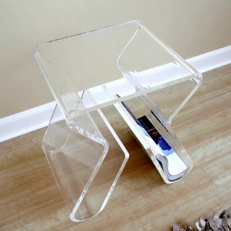 インスタグラム風のシンプルでスタイリッシュな透明アクリルサイドテーブル|デザイナーズ異形デザインの小ぶりなコーヒーテーブル|リビングを華やかに演出する現代的な選択!