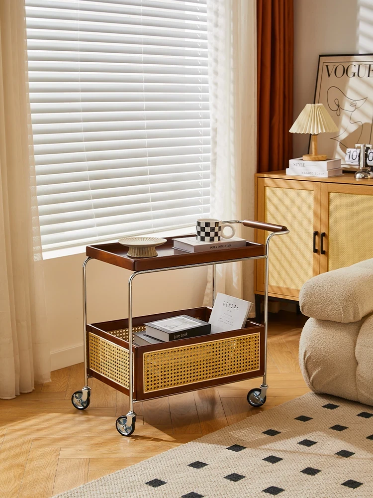 レトロなモバイルソファサイドテーブル、小さなキャスター付きトロリー、リビングルーム用中古ベッドサイドキャビネット、収納棚、北欧風無垢材とラタン編みのコーヒーテーブル【便利でスタイリッシュなインテリア】