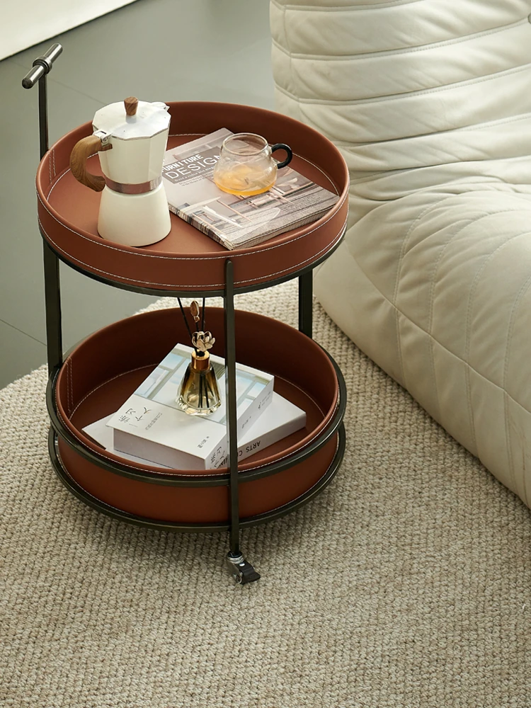 北欧スタイルのシンプルな丸形リビング移動式トロリーソファサイドテーブル、軽奢華で多機能な収納サドルレザー製スナックワゴンで、スタイリッシュな空間を演出します!