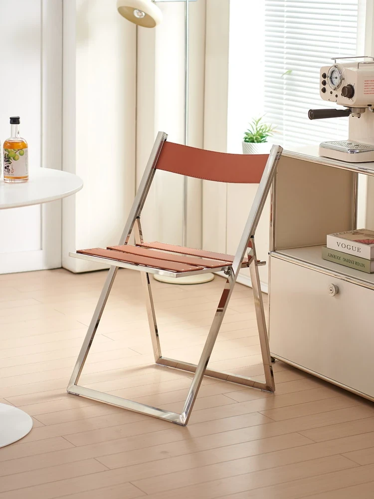 "Nordic Modern Minimalist Dining Chair - Stylish Stainless Steel Folding Backrest Chair with Luxe Saddle Leather Upholstery for Elegant Home Décor"