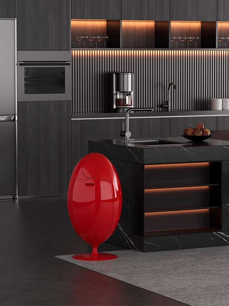 Eco-Friendly Yellow Dinosaur Egg Trash Bin - Stylish Floor Display for Open Kitchen in Luxury Apartments and Villas.