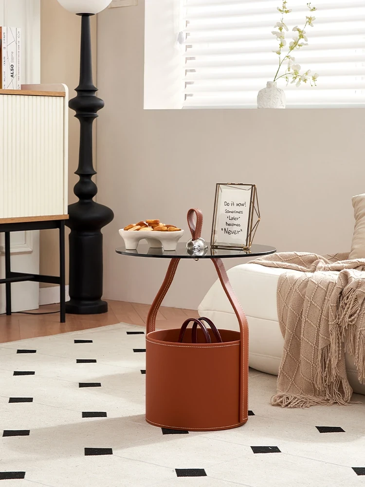 Nordic Style Handheld Sofa Side Table – Italian Luxury Handmade Saddle Leather Storage Coffee Table, Creative Nightstand for Chic Home Décor