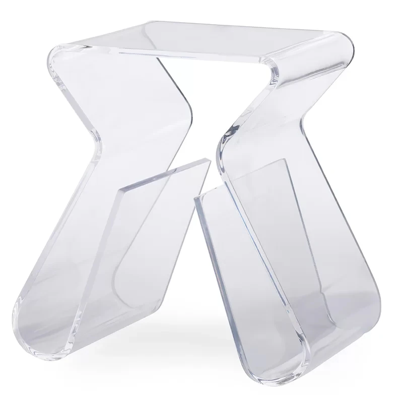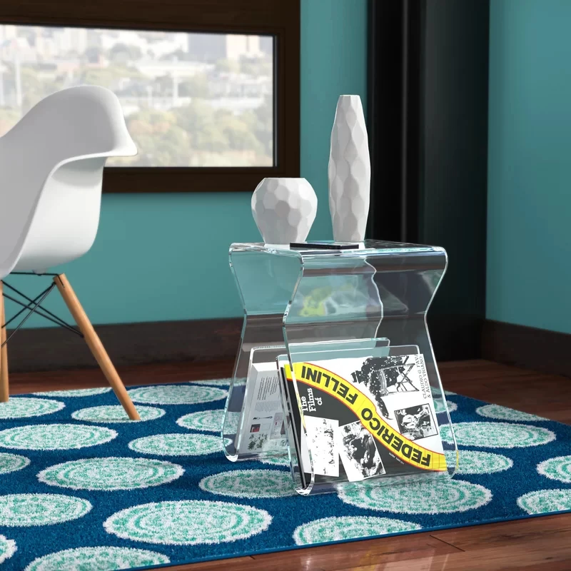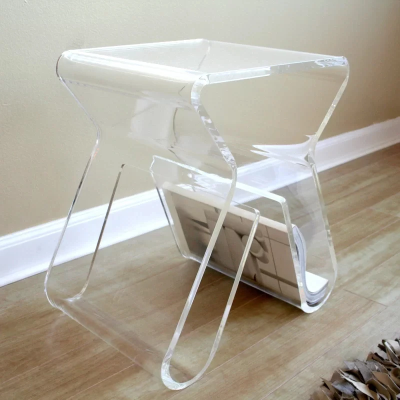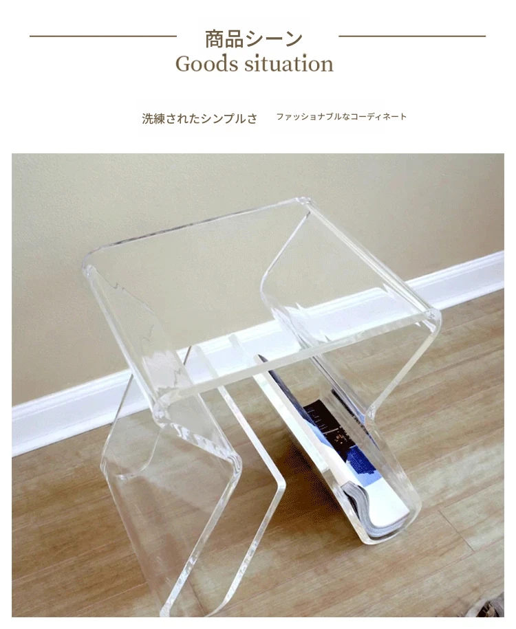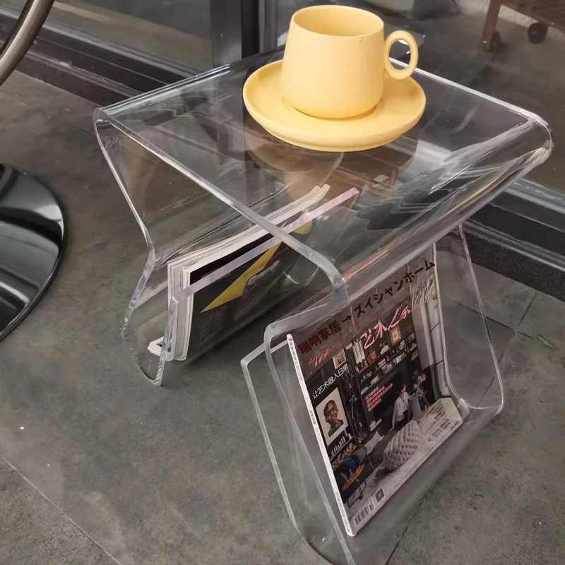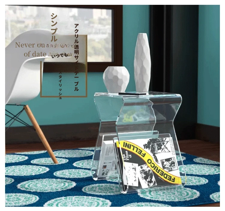 インスタグラム風のシンプルでスタイリッシュな透明アクリルサイドテーブル|デザイナーズ異形デザインの小ぶりなコーヒーテーブル|リビングを華やかに演出する現代的な選択!