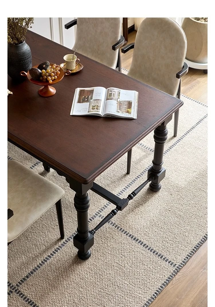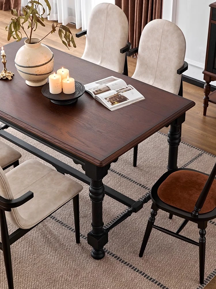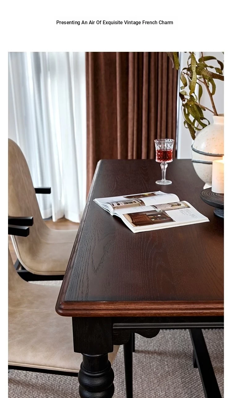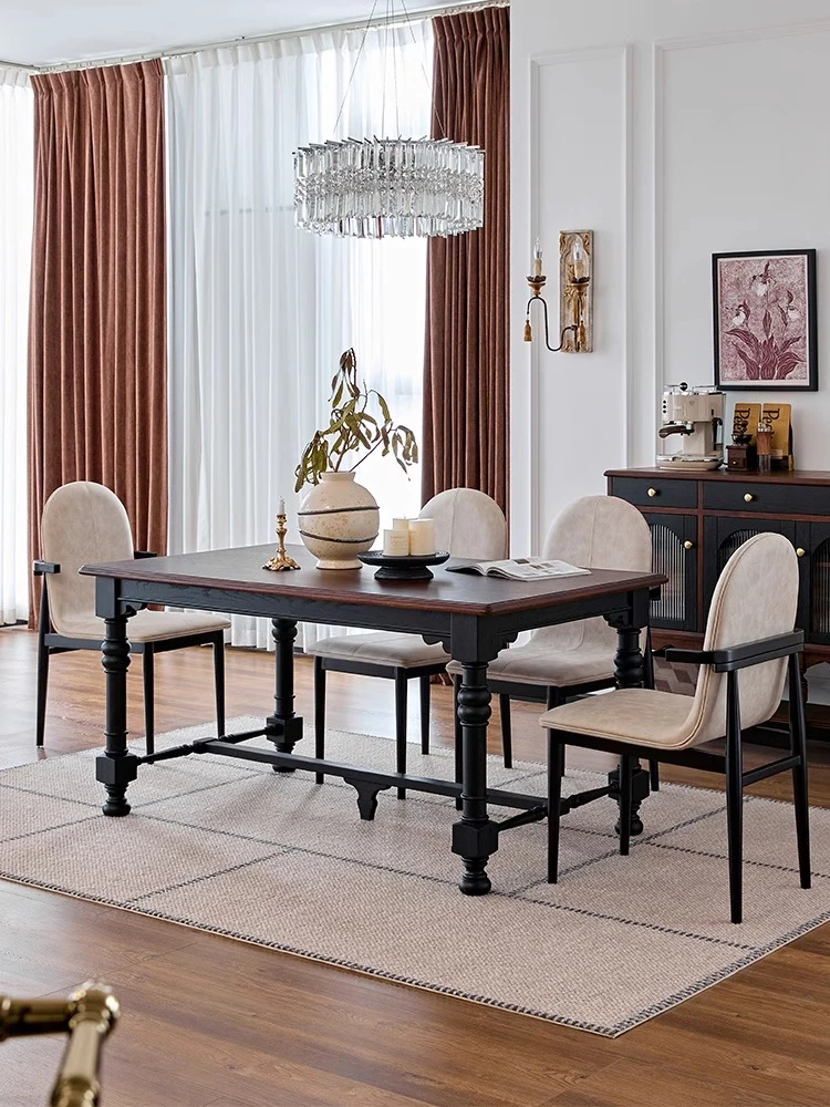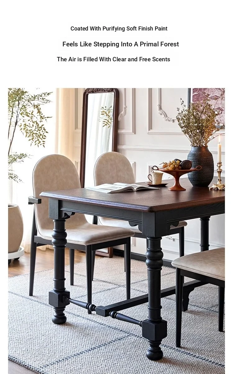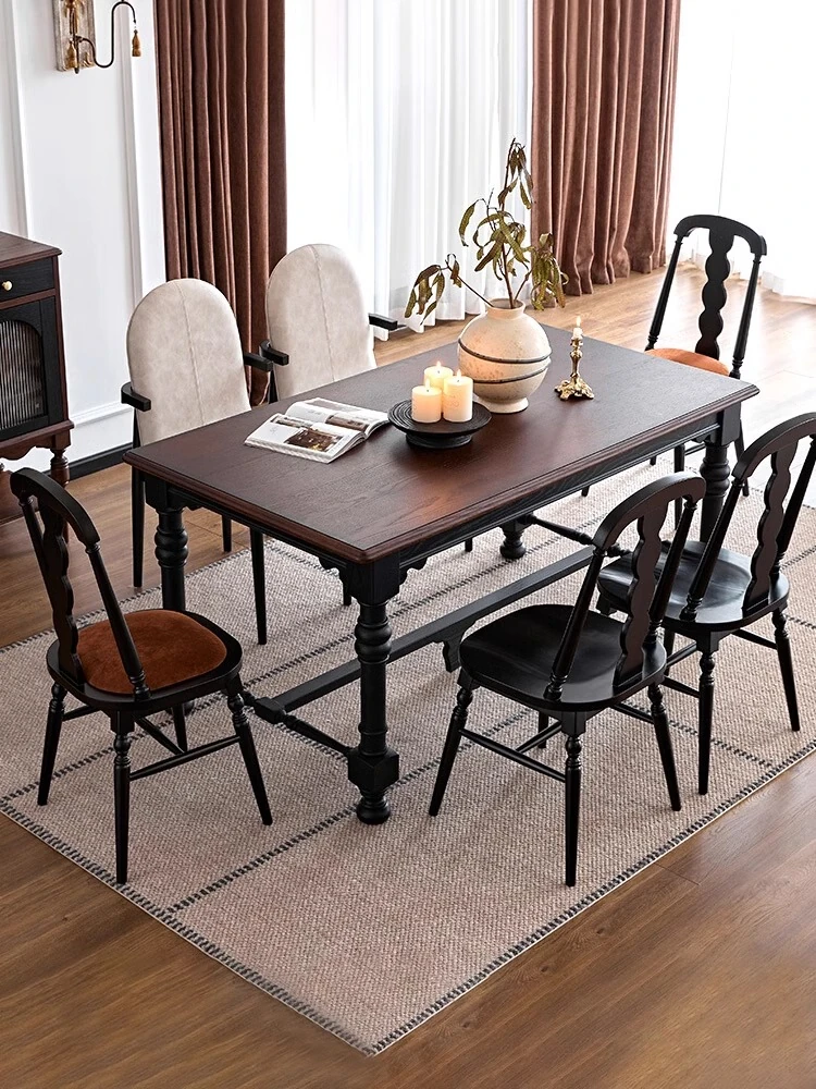 アメリカンレトロ革新!高級感溢れる無垢材ダイニングテーブル - フレンチヴィンテージデザイン、小型住居にも最適な黒の長方形テーブル。リビングを彩るスタイリッシュな一品!