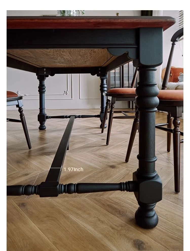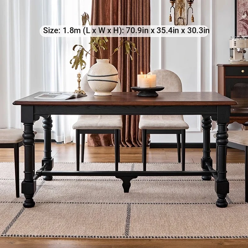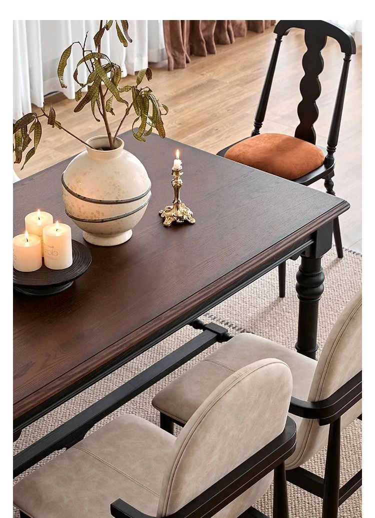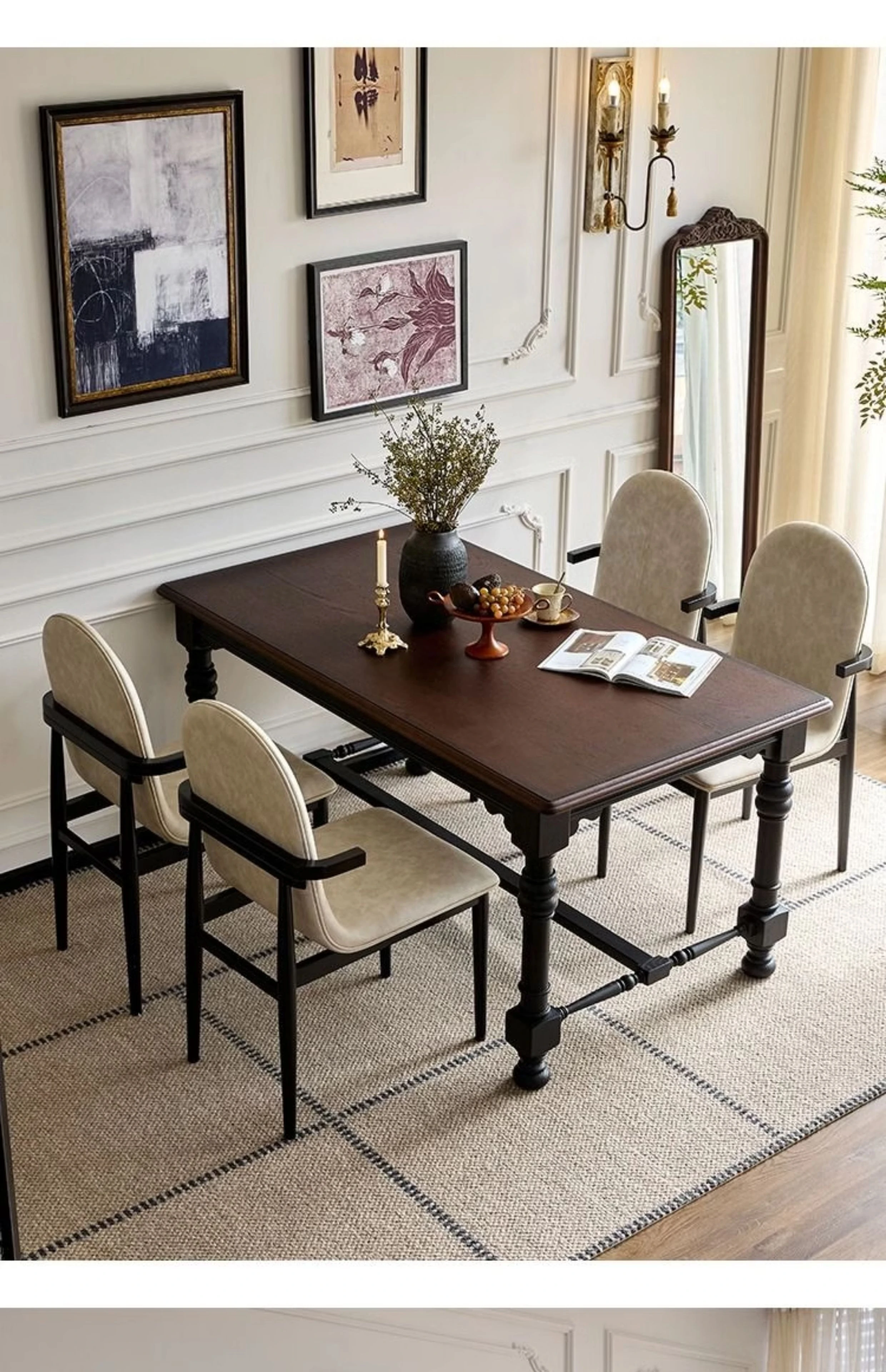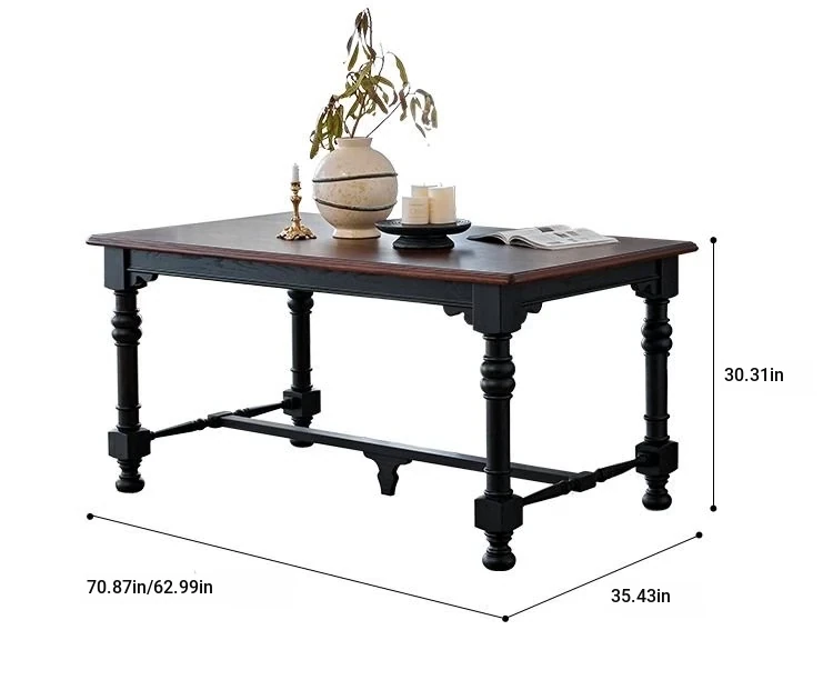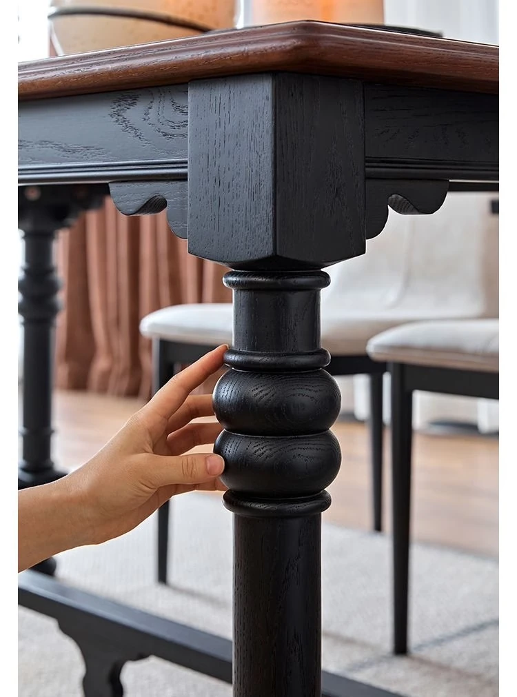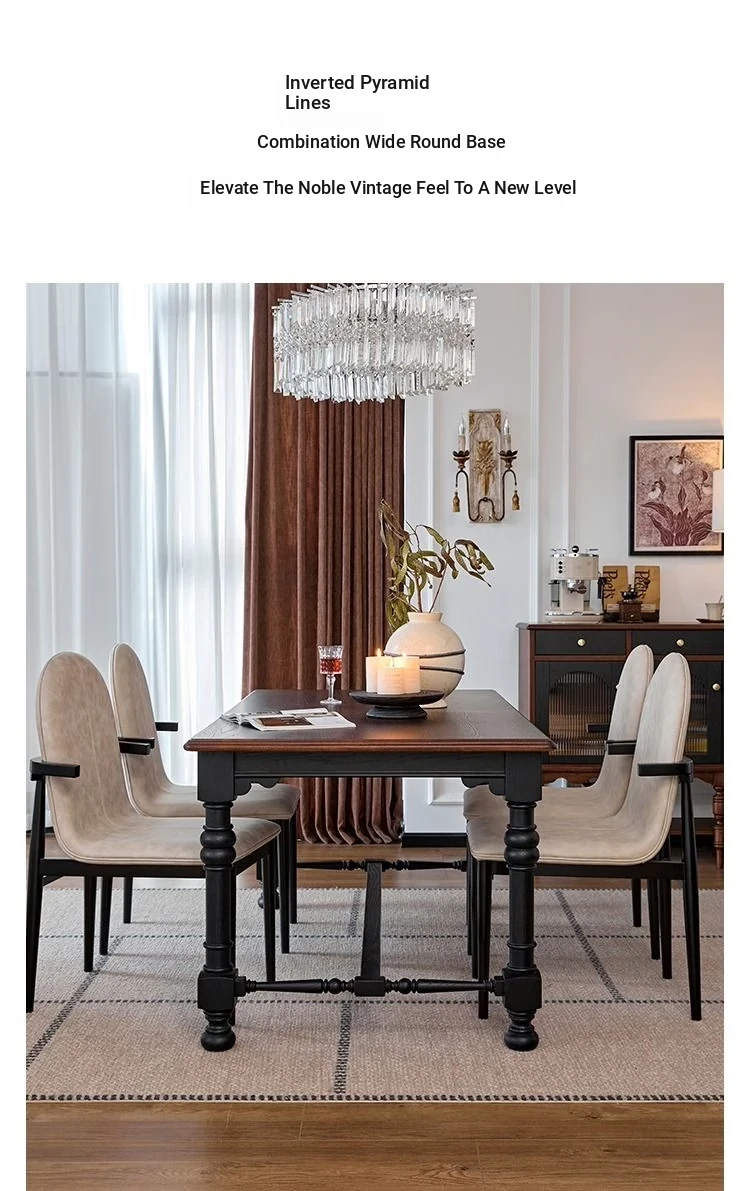 アメリカンレトロ革新!高級感溢れる無垢材ダイニングテーブル - フレンチヴィンテージデザイン、小型住居にも最適な黒の長方形テーブル。リビングを彩るスタイリッシュな一品!