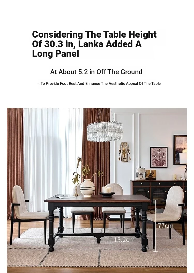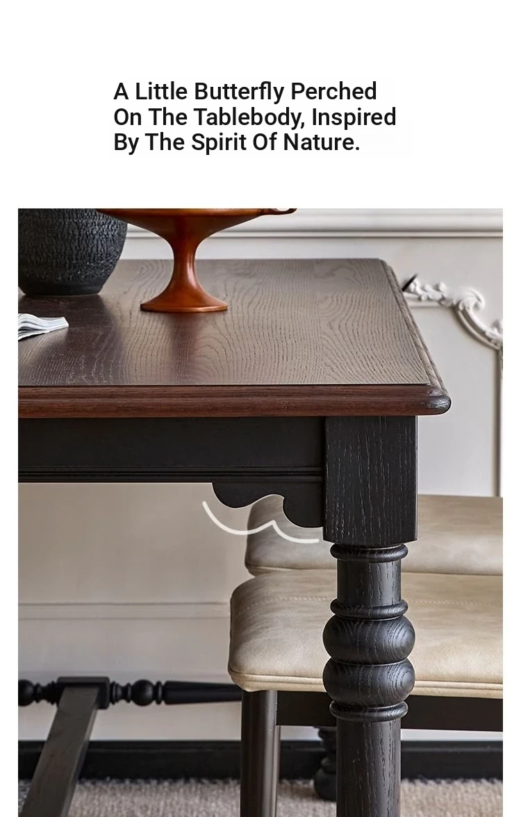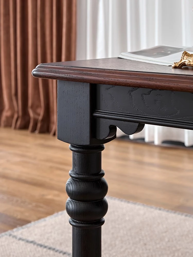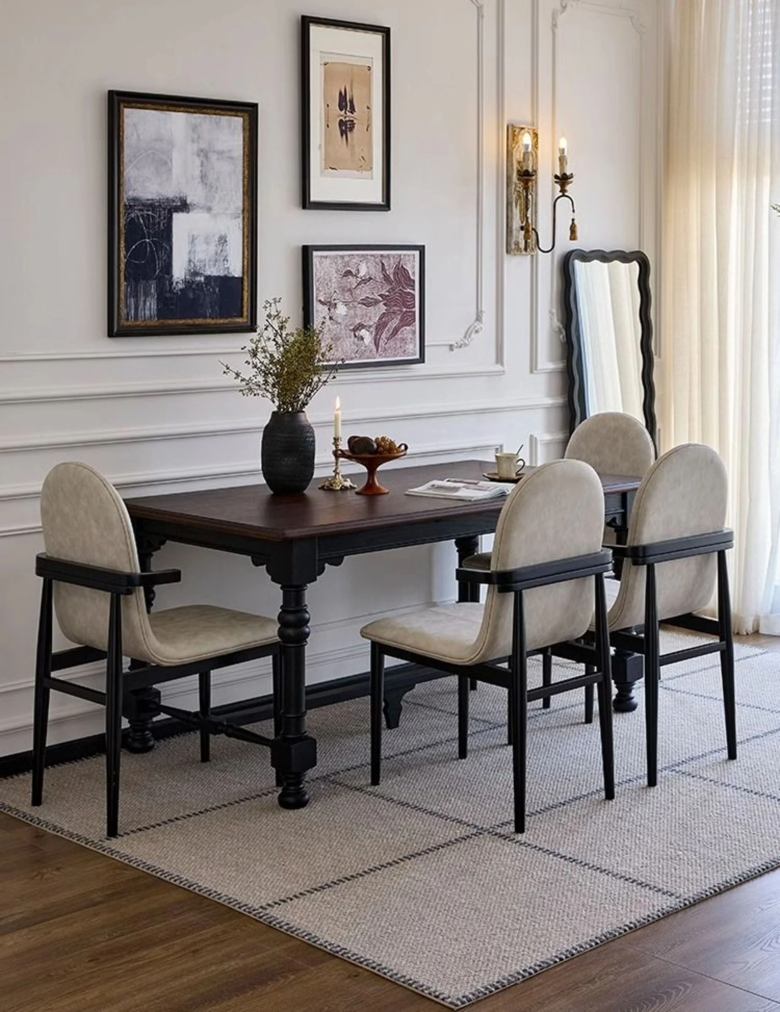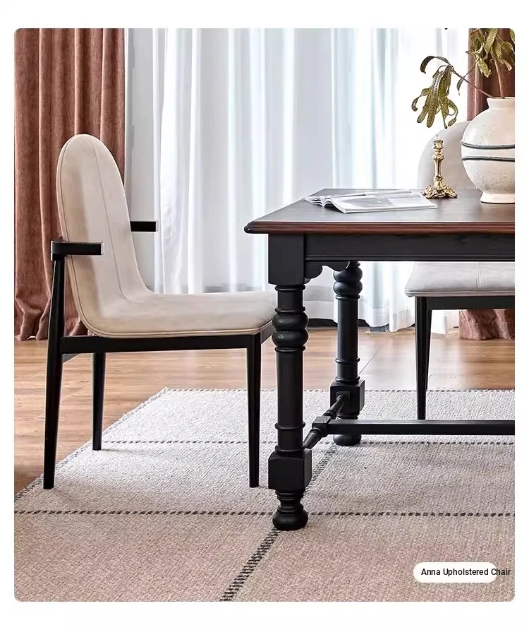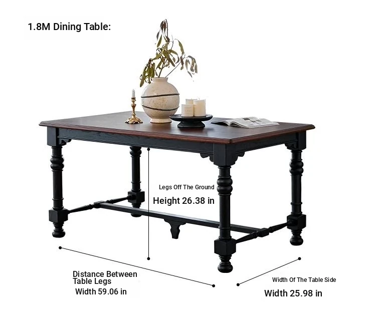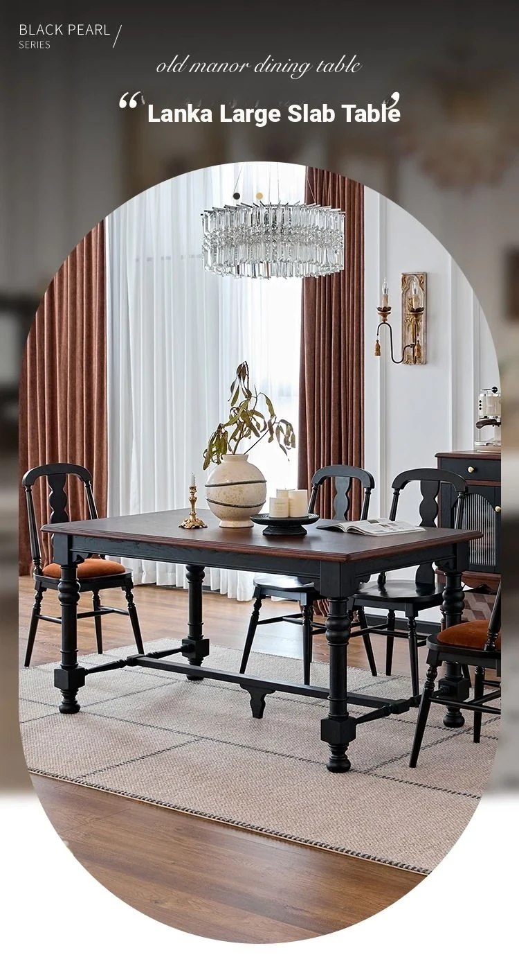 アメリカンレトロ革新!高級感溢れる無垢材ダイニングテーブル - フレンチヴィンテージデザイン、小型住居にも最適な黒の長方形テーブル。リビングを彩るスタイリッシュな一品!