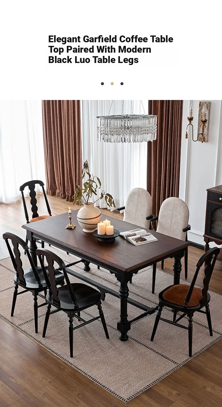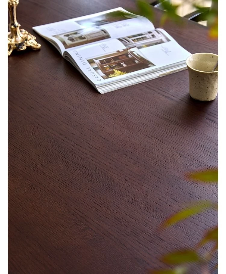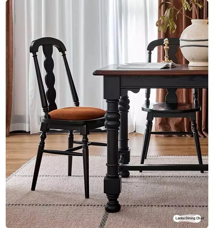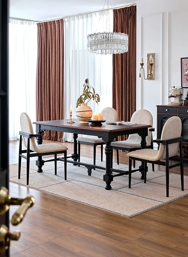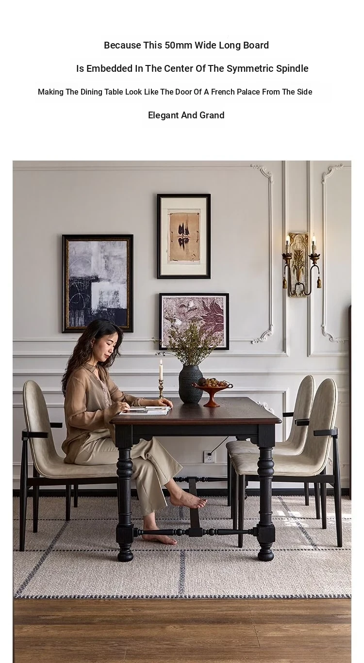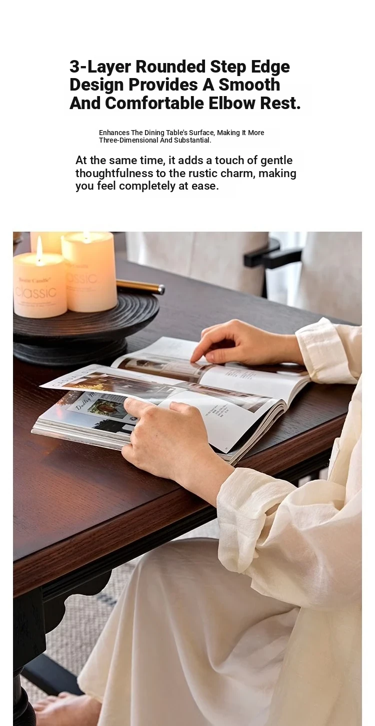 アメリカンレトロ革新!高級感溢れる無垢材ダイニングテーブル - フレンチヴィンテージデザイン、小型住居にも最適な黒の長方形テーブル。リビングを彩るスタイリッシュな一品!