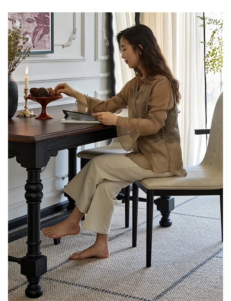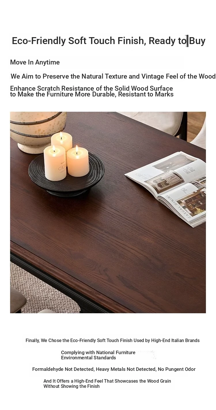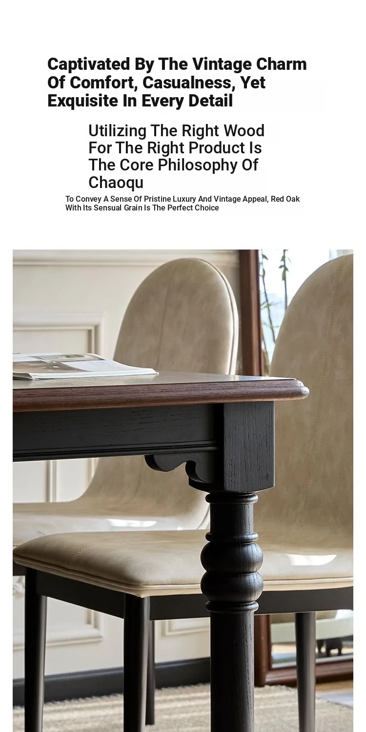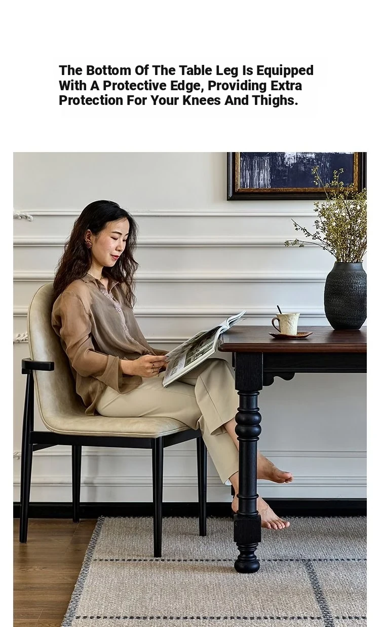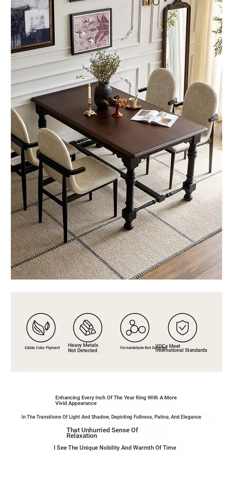 アメリカンレトロ革新!高級感溢れる無垢材ダイニングテーブル - フレンチヴィンテージデザイン、小型住居にも最適な黒の長方形テーブル。リビングを彩るスタイリッシュな一品!